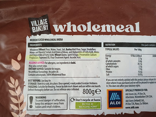 In the UK, calcium propionate is most commonly found in long-shelf-life, soft, plastic-packaged sliced loaves. This includes many standard white, wholemeal and “50/50” sandwich breads from big brands and supermarket own ranges. It doesn’t usually matter if the loaf is labelled wholemeal, low sugar, or high fibre – many still contain E282.