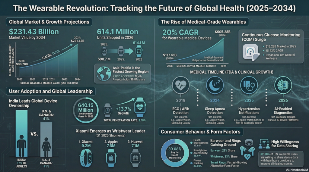 - The global wearable technology market reached $86.78 billion in 2025 and is projected to hit $231.43 billion by 2034 (CAGR 11.6%)[1]